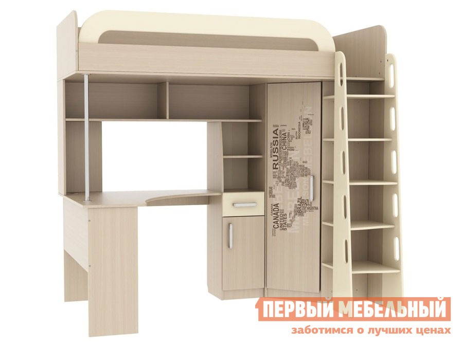 Габаритные размеры ВхШхГ 1875x2042x1106 мм. Кровать-чердак Мультиплекс объединяет в себе и заменяет сразу несколько изделий, что удобно и выгодно. В него входят: угловой письменный стол, угловой шкаф для одежды, полки для хранения и место для сна. Изделие компактно располагается в комнате, не занимая большую площадь.