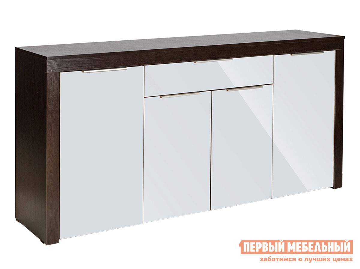 Комод выглядит презентабельно и массивно. Красивые глянцевые фасады в сочетании с деревянным корпусом смотрятся очень стильно. Внутри крайних отделов находятся по три полки. За распашными дверцами в центре — одна полка.