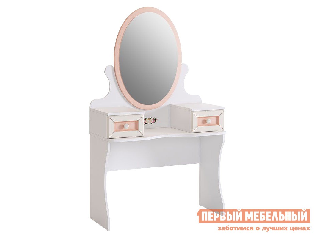 Дверки боковых ящичков трюмо окантованы резным декором, который дублирует игра цветов – белого и зефирно-розового. В центре над полочкой изделие украшает изумительная цветочная аппликация. Материал исполнения изделия - ЛДСП.
