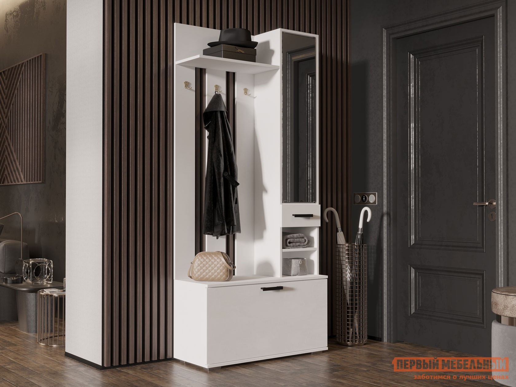 Внутреннее наполнение предусматривает открытую вешалку для размещения верхней одежды, а также закрытое отделение под обувь. Небольшой выдвижной ящик поможет держать полезные мелочи и аксессуары в быстрой доступности.