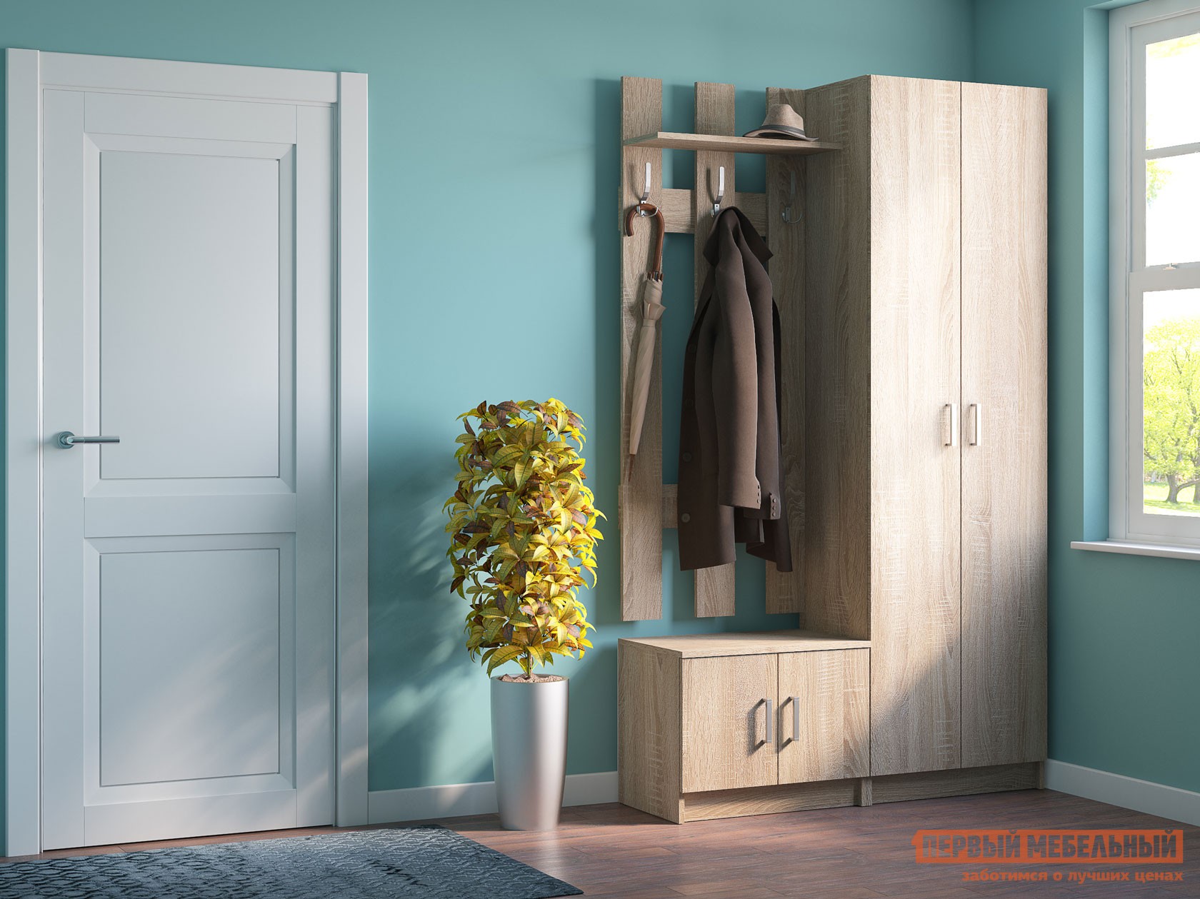 Шкаф имеет ширину 600 мм, внутри есть штанга для вешалок. Ширина тумбы и открытой вешалки составляет — 582 мм. У тумбы за дверцами — вместительное отделение для обуви.