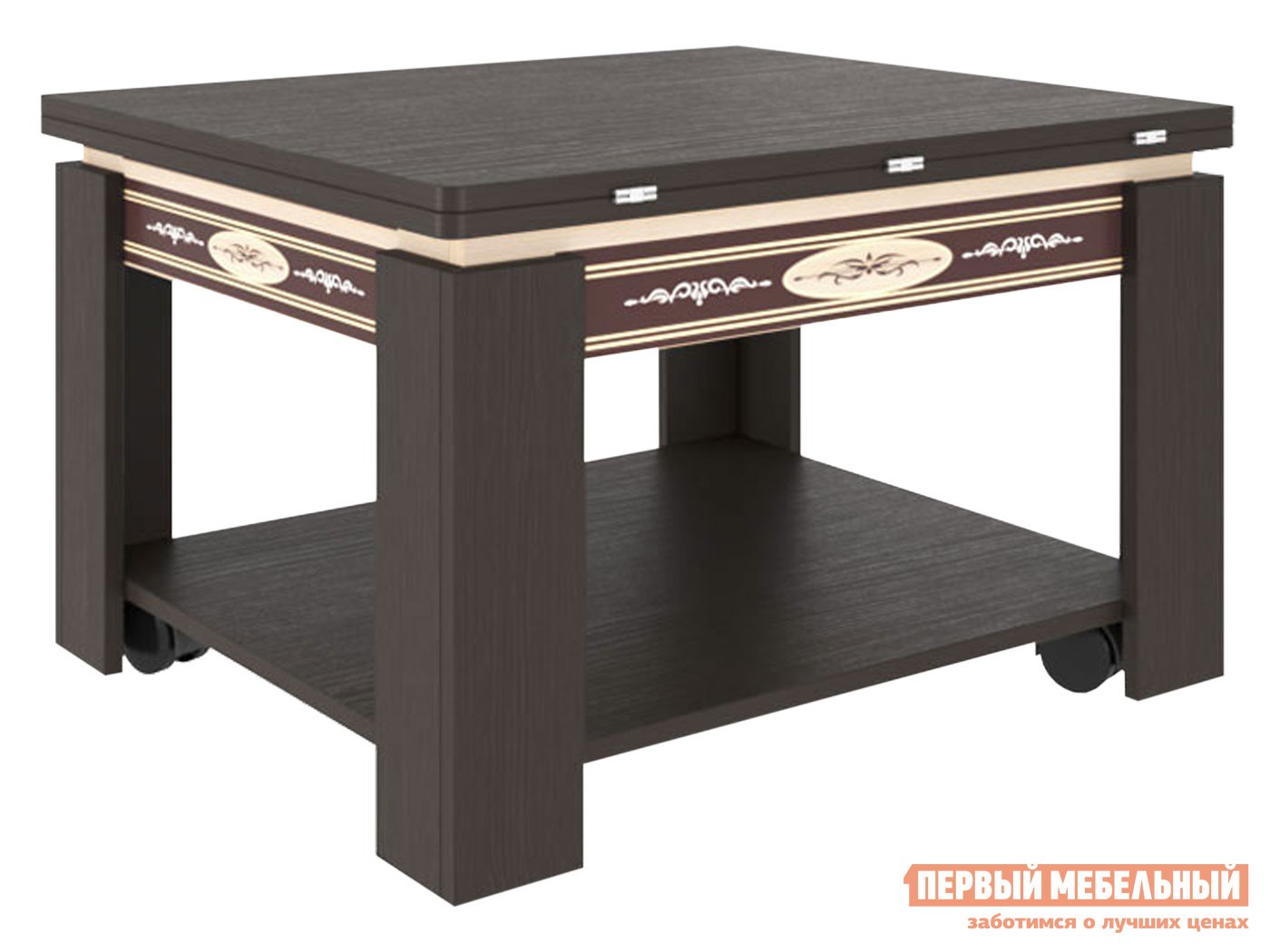 Габаритные размеры ВхШхГ 430x700x620 мм. Элегантный журнальный столик Адам стильно разнообразит как классический, так и современный интерьер гостиной или спальни. Царга модели декорирована изящными рисунком. Благодаря поворотно-раскладному механизму столик раскладывается, позволяя быстро сервировать чай к приходу гостей. В основании есть полочка для мелочей. За ножками спрятаны колесики для легкого перемещения по комнате. Рисунок нанесен при помощи принтерной печати.