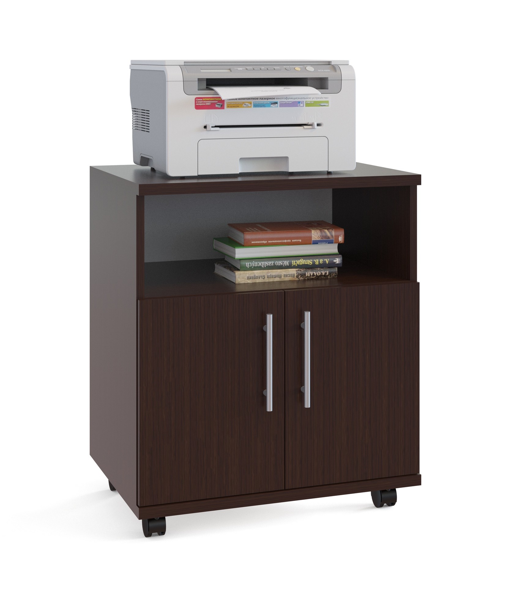 Габаритные размеры ВхШхГ 694x600x446 мм. Универсальная тумба под офисную технику. Служит для меблировки рабочего кабинета или конференц-зоны. Размеры (ВхШхГ): 694 х 600 х 446 мм. Тумба имеет открытую нишу и закрытый шкафчик с полкой. Оборудована колесиками для удобного перемещения по комнате.